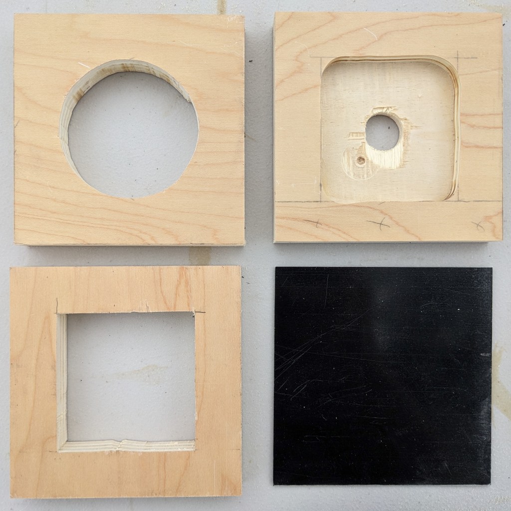 - Cut out all the pieces for the lamp. I used plywood because I had it lying around and because it stays flat. The large circle in the topmost square will accept the hurricane lamp shade I found from Amazon. It’s rough but will be hidden later when mated to the shade with hot glue. The middle block acts as the rest for the shade and is routed out on the bottom to make more room for the circuit board which goes underneath. The final block is hollowed out to make room for the board as well. The black square is a plastic base plate to keep everything contained.