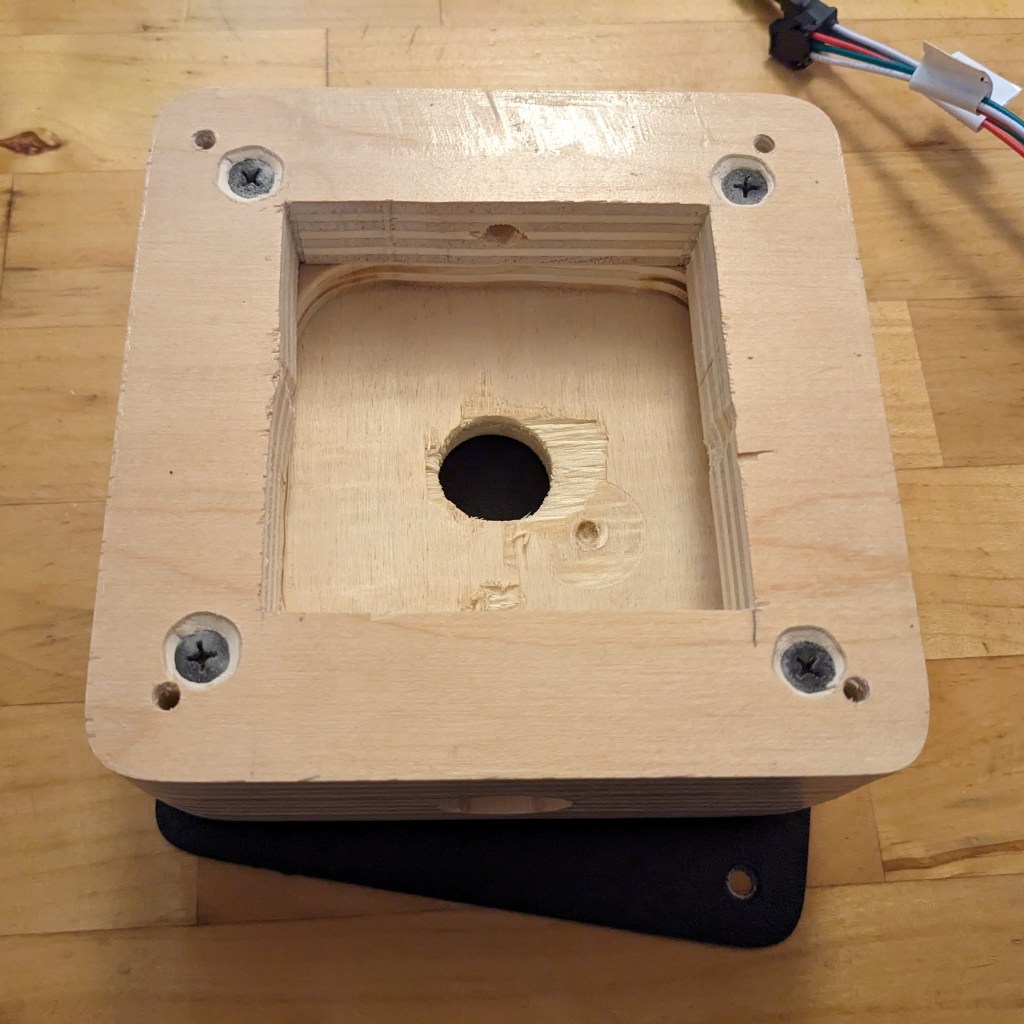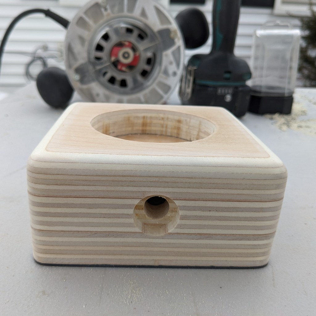 - Used a 1″ fostner bit to make a 1/2″ inset for the motion sensor and then drilled another hole inside of that to make a channel back to the electronics cavity. The idea here is to limit the motion sensor’s field of view so it acts more as a beam instead of picking up the entire room. This was important because I don’t want it to pick up the kid’s movement when they’re in bed sleeping, but I do want to know if they’re out of bed so I can temporarily raise the light level/fire an out-of-bed alert.