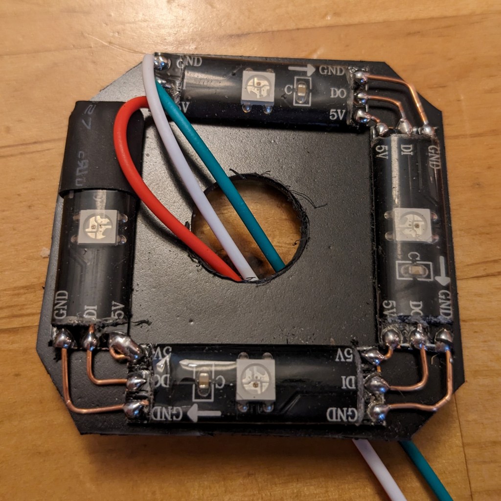 - I wanted the light to be color changeable and what I had was a strip of neopixel style LEDs. Cut them into segments, mounted them on another block of plastic to hold them stable, and soldered them up in series.