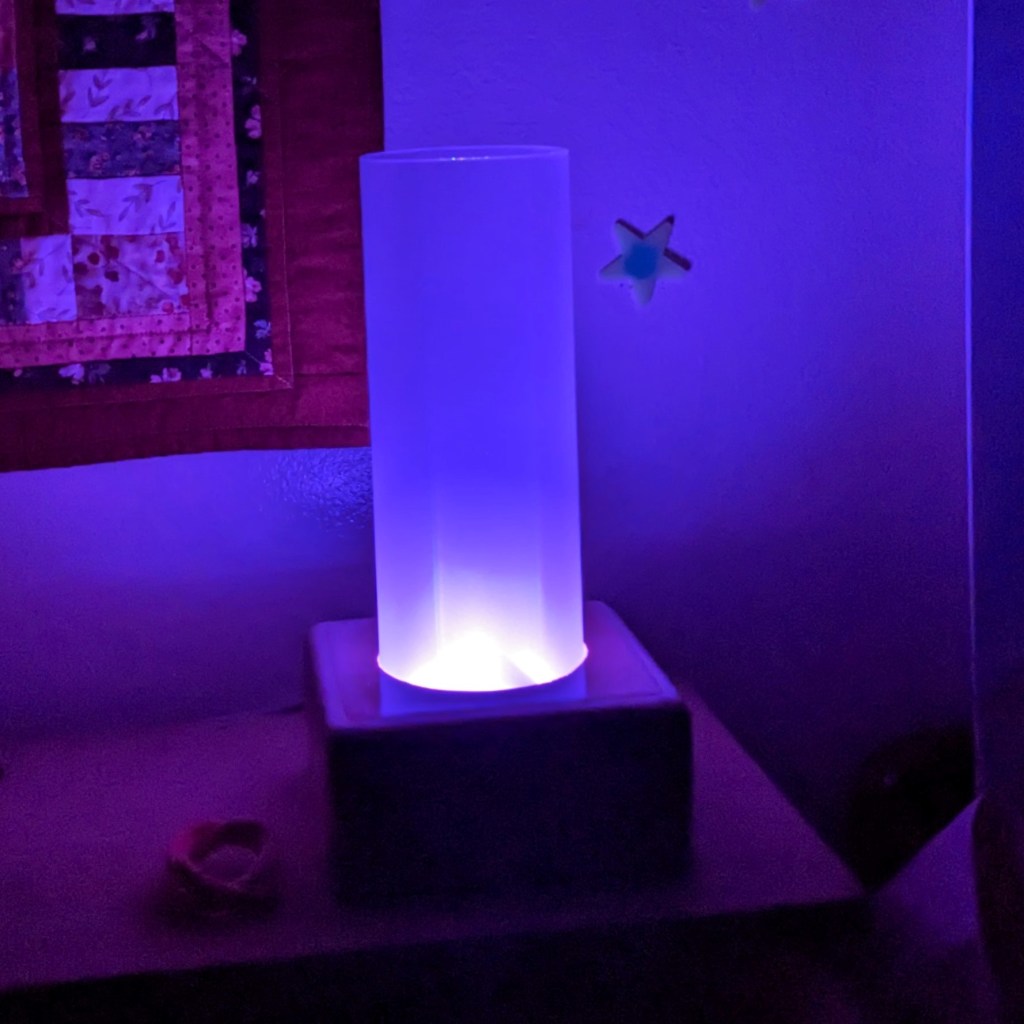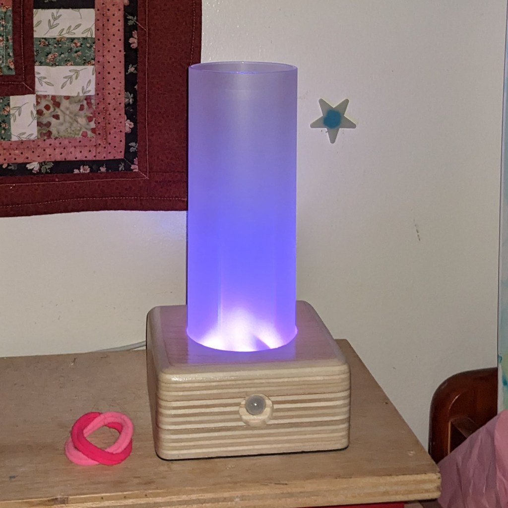 The light is integrated with Home Assistant but I haven’t had time to get fancy yet. Right now it turns on (purple) based on a time helper called “kid bedtime” and turns off when the house status changes to “early morning”. When I have time I want to add a button to the lamp that will cycle colors through a pre-set list. I also want to write an onboard automation that dims the light after a certain period of no motion and brings it up again when motion is detected.